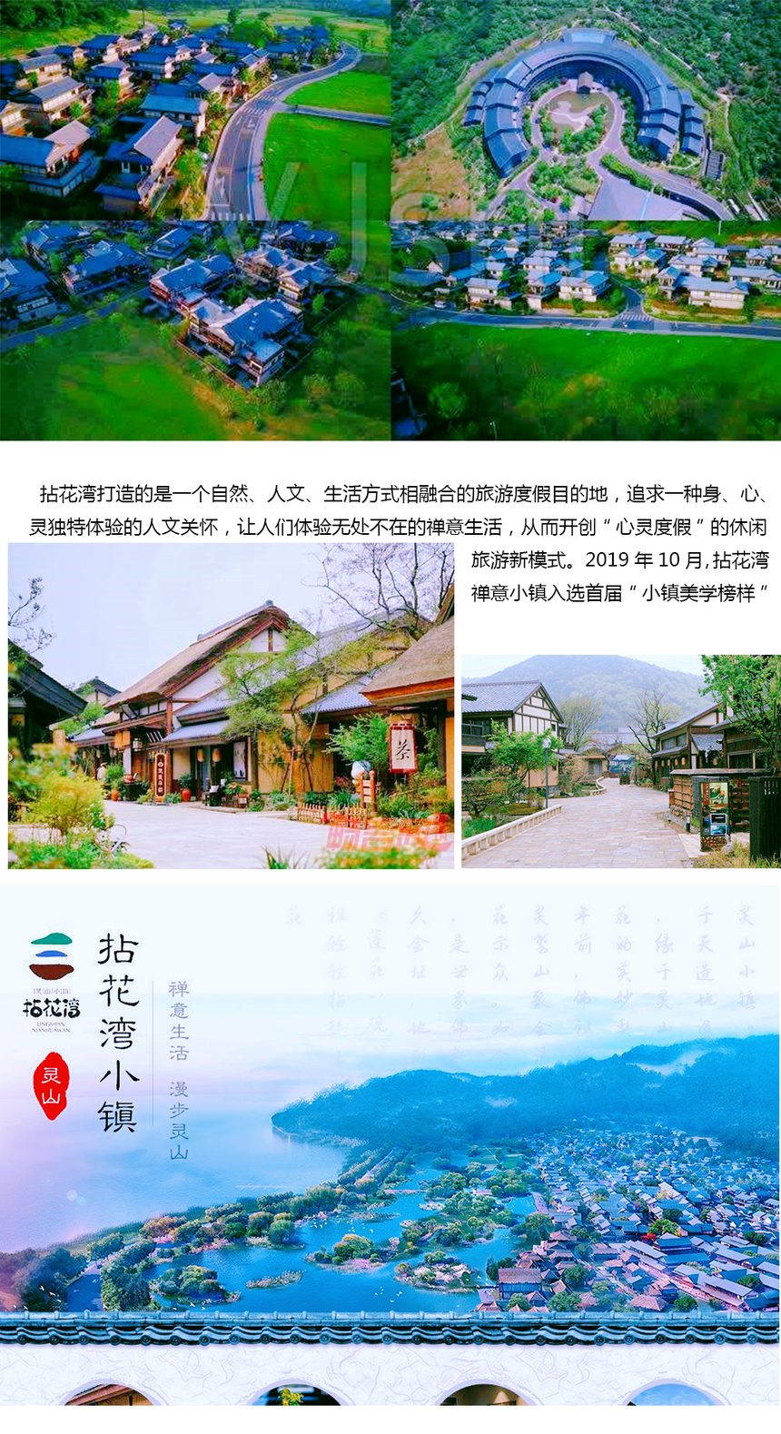 拈花湾位于无锡。这里集翠隐秀、气象万千,湖光山色尽在怀抱之中,以“禅”为核心文化主题,打造的集景区游玩、主题住宿、会务服务、婚礼定制、禅修体验等于一体的“心灵度假目的地”。 这里向来有“净空、净土、净水”之称,生态秀美,环境优越。而拈花湾靠山面湖,更与驰名中外的灵山大佛依山为邻,可以说是得尽天地人文灵气。 “拈花湾”的命名,一方面源于灵山会上佛祖拈花而迦叶微笑的经典故事拈花一笑,同时也缘于它所在的地块形似五叶莲花的神奇山水。小镇整体建筑风格与日本奈良虽然相似,但其实是源自于唐朝时期的建筑结构,融入了中国江南小镇特有的水系,打造出了一种独有的建筑风格,使得整个小镇沉浸在美轮美奂的意境中。 拈花湾打造的是一个自然、人文、生活方式相融合的旅游度假目的地,追求一种身、心、灵独特体验的人文关怀,让人们体验无处不在的禅意生活,从而开创“心灵度假”的休闲旅游新模式。2019年10月,拈花湾禅意小镇入选首届“小镇美学榜样”名单。